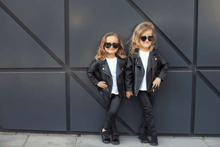 Two sisters in same outfits: white t-shirts, leather black jackets and leggings, sunglasses hearts.