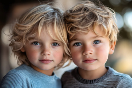 Two blond boys with blue eyes standing closely together, showing childhood innocence