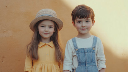 Two kids stand side by side in front of a sunlit wall. The girl wears a yellow dress and hat, while the boy is in a white shirt and denim overalls, both smiling happily.