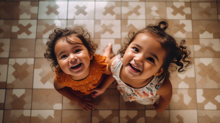 Cheeky kids Top view of two cute little children looking at camera and smiling while lying on the floor with plastic colorful letters laying around them : Generative AI
