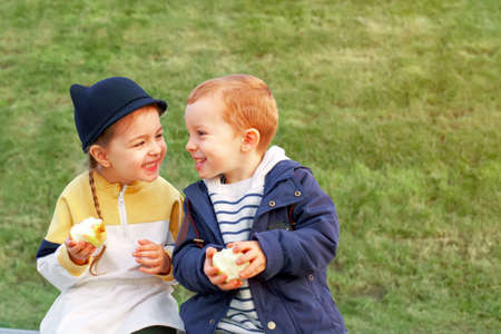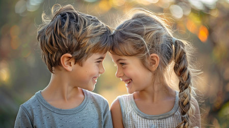 Two happy kids boy and a girl smiling together in the park outdoor