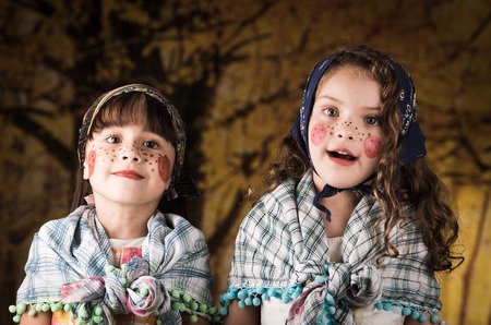 Cute little girls dressed as a traditional swedish easter witches with headscarves and red cheeks
