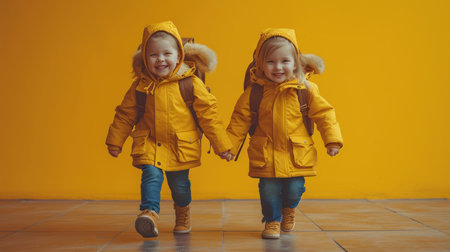 Two little girls in a yellow raincoat and boots on a yellow background