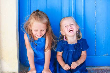 Portrait of Little smiling girls sitting near old blue door in Greek village, Emporio, Santorini