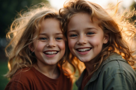 Two young siblings with curly hair share a cheerful hug in golden sunlight