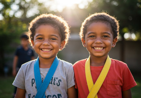 Two young children joyfully posing together for a portrait.