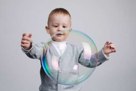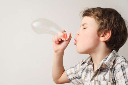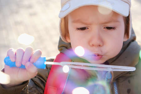 boy play with soap, blowing bubbles, cute fun happiness childhood