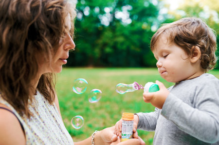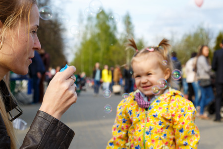 Mother with daughter outdoor playing and making soap bubbles. Beautiful young smiling woman blowing bubbles to smiling little girl. Childhood and parenthood concept. Baby-sitter with kid