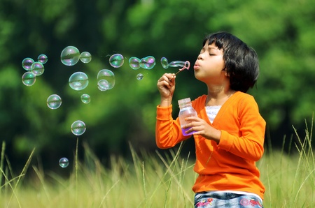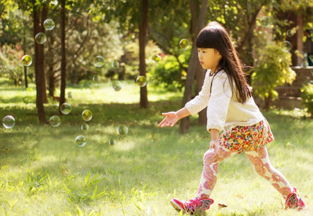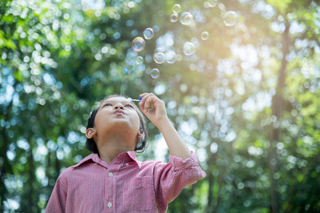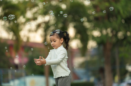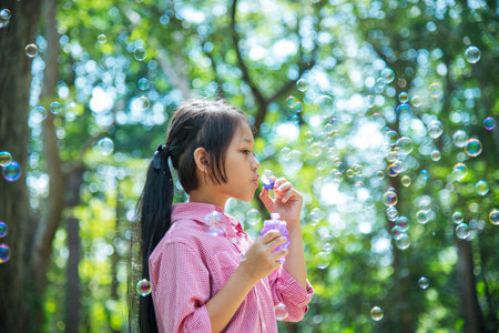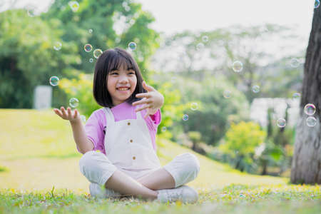 Lovely active little asian girl playing with soap bubble outdoor in the park