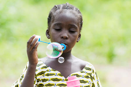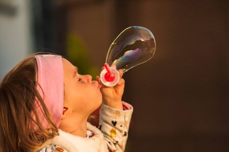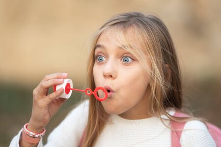 Head shot of small girl blowing bubbles. Cute kid playing with bubble wand and blowing soap bubbles.