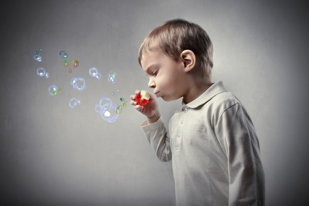 Boy with Blond Hair Blowing Bubbles Outdoor