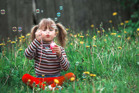 Cute little girl wearing a pink shirt blowing bubbles in the park,vintage style.