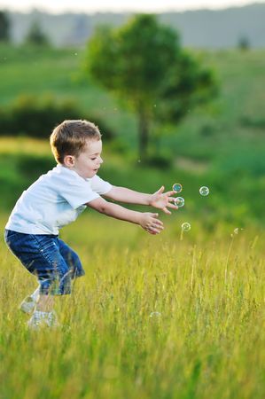 happy young beautiful child have fun on eadow with soap bubbles toy