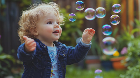 Child playing outside in a garden during day time with bubbles he is happy and running