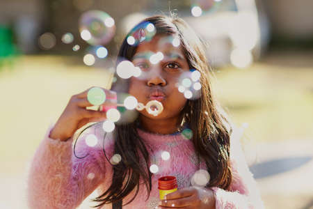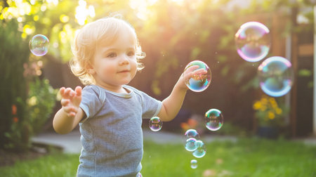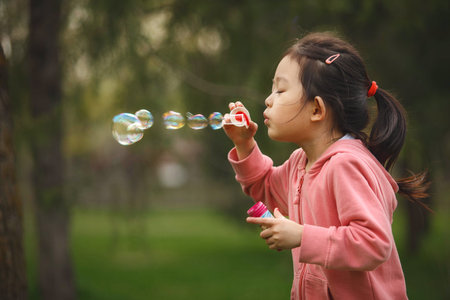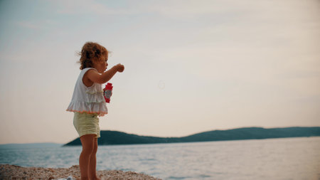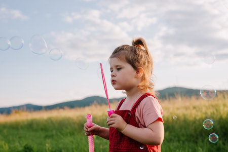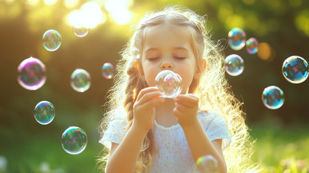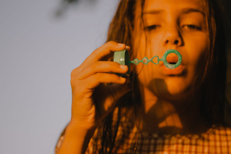 A young girl creates bubbles outdoors, focusing on the ephemeral beauty and joy of childhood activities. Soft, warm sunlight. Kid blowing bubbles.