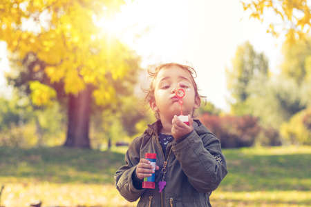 Little girl with bubble wand blowing soap bubbles in autumn park.