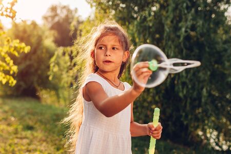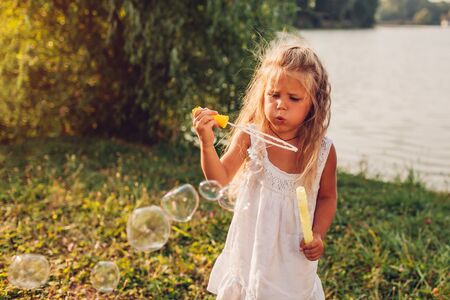 Little girl blowing soap bubbles in summer park. Child having fun with toy outdoors