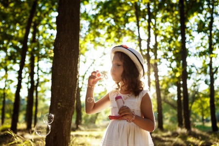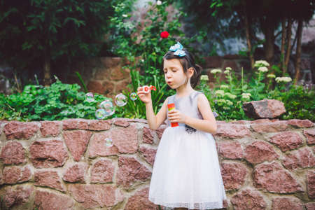 Child and soap bubbles. Little girl having fun with soap bubbles. Child little girl in a dress blows a soap bubble in the park. Summer and vacation theme.