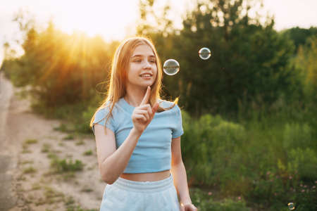 Cute girl with a beautiful smile catches soap bubbles on the background of a beautiful sunset.