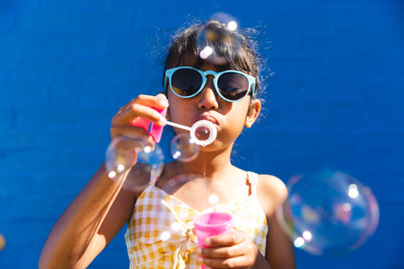 Biracial girl wearing sunglasses and a sundress enjoys blowing bubbles outdoors. She creates a playful atmosphere on a sunny day.