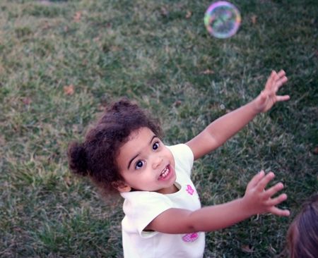 Happiness is a few bubbles away. an adorable little girl playing with bubbles outside.