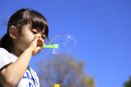 Japanese girl playing with bubble under the blue sky (5 years old)