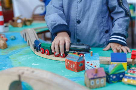 Kids play with toy train railway. Child playing with wooden trains. Toys for little boy. Preschooler building rail road and blocks at home or daycare, preschool. Kindergarten educational games.