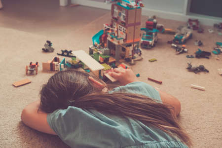 Elementary school student spends time at home playing blocks constructor set. Leisure time, creativity development, stay at home isolation time concept