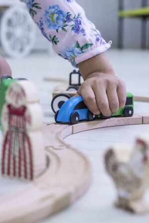 baby hands playing and learning with wooden train set on wooden rails on a carpet in nursery at home