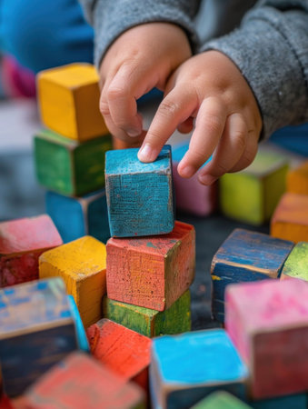 Minimalist close-up photo of child playing with blocks on table. High quality photo