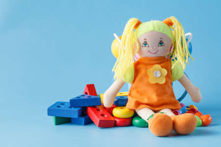 Mix of wooden toy blocks with doll on blue background