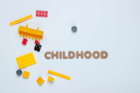 Childhood concept. Toy bricks on white paper background. Top view