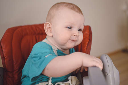 Little emotional newborn funny toddler boy sitting on feeding high chair. Baby facial expressions and goods packaging template. Healthy child, concept of hospital and happy motherhood. Infant baby