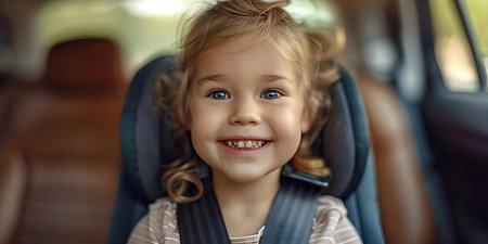Securely buckled happy child ready for road trip. Concept Family Road Trip, Child Safety, Buckled Up, Happy Travelers, Secure Drive