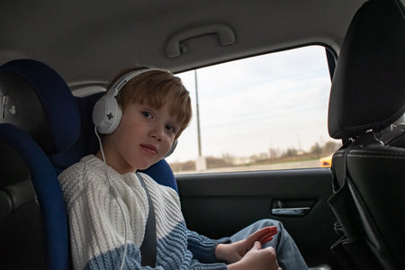 A boy in white headphones is sitting in the car, The concept of spending time on long trips. How to entertain a child