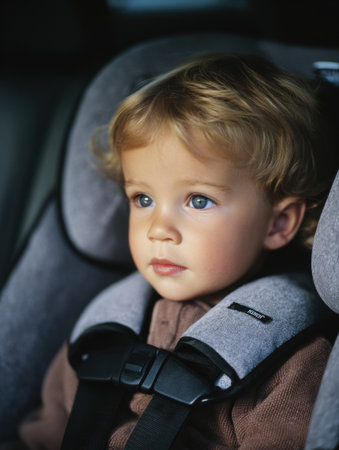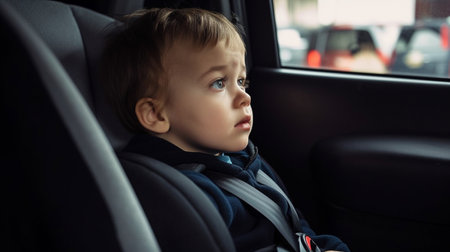 A two-year-old boy in a car safety seat looks out the window, thanks to Generative AI.