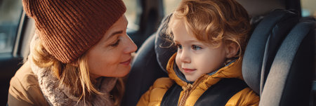 A mother gazes affectionately at her young child who is seated in a car, both ready for a winter adventure on a sunny day.