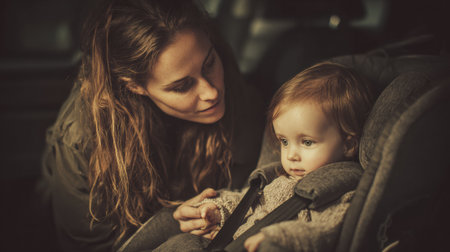 Mother secures her young daughter in a baby car seat inside a vehicle in a residential area during daylight hours.