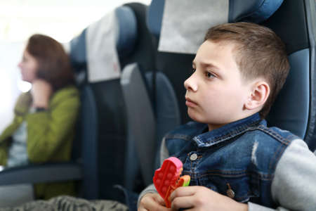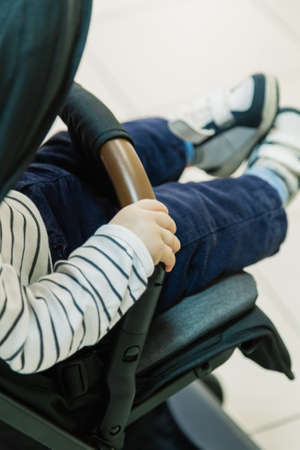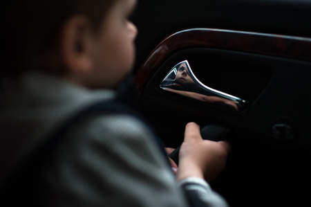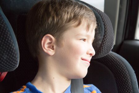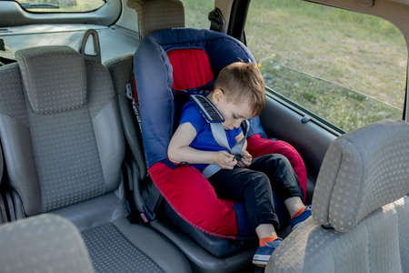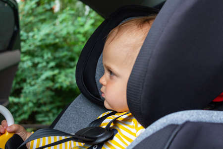 Portrait of a preschooler boy sitting in a car seat and wearing a belt. ? hild bored during a family trip. Safety of transportation of children.