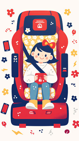 Illustration of a child safely seated in a car seat, engaging with a digital device surrounded by cheerful decorative elements.