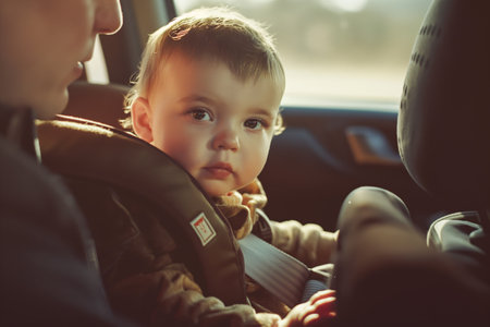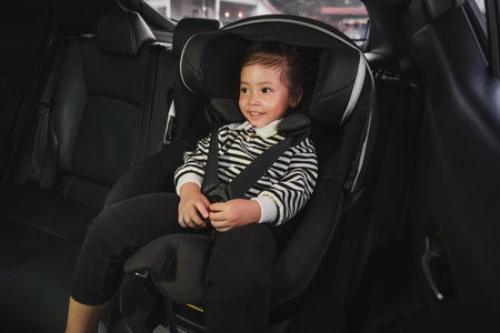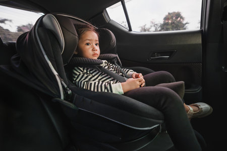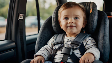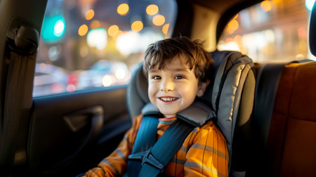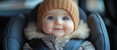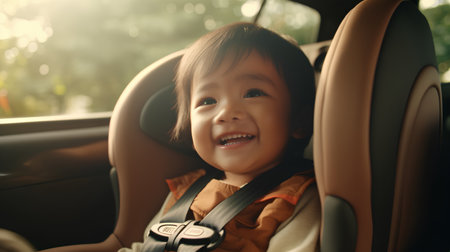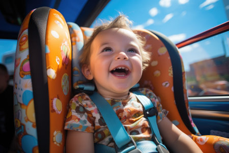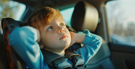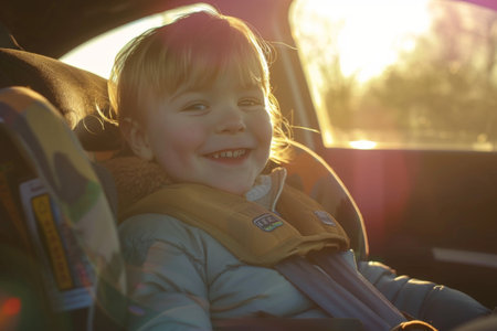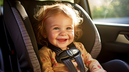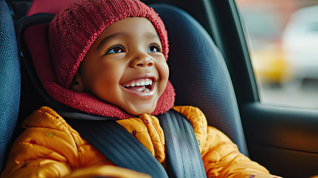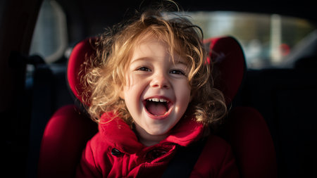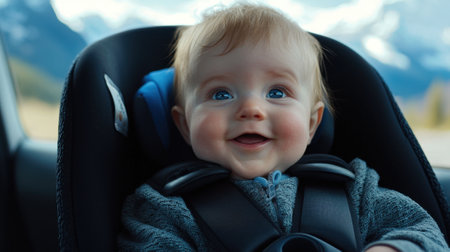 With a sense of adventure and anticipation, the happy child eagerly awaits the next destination from their cozy car seat.