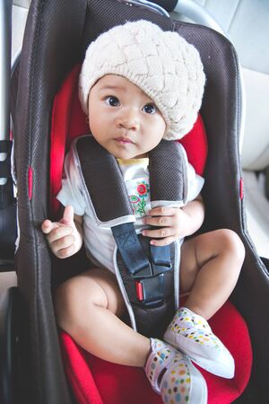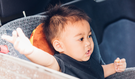 Adorable Asian kid boy (Toddler age 1-year-old) Protection Sitting in the Car Seat with Safety Belt Locked. Family Journey and Baby Careful Concept. Portrait CloseUp Copy Space, and Blurry Background.