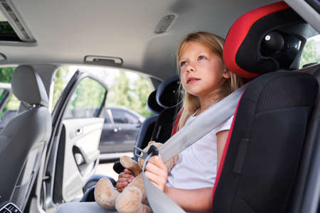 Lovely little girl in the back seat of a car. Children traveling in a car