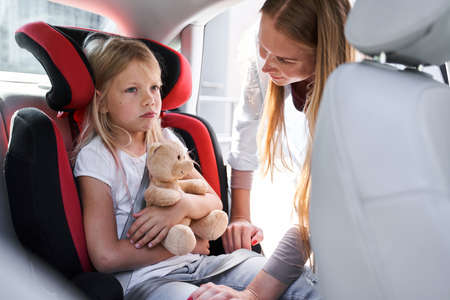 Young blond woman helping her cute little daughter fasten seat belt before driving