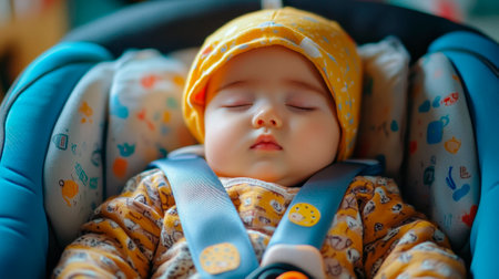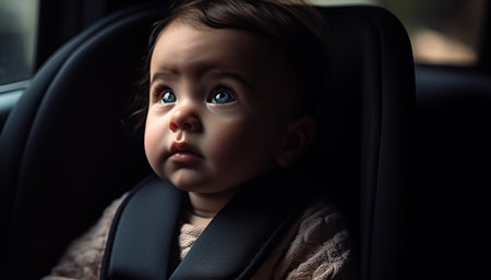 Baby child sitting in car seat. Safety first concept. Generative AI