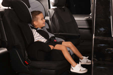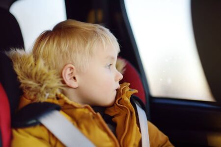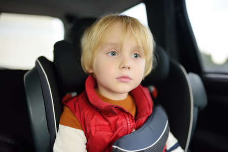 Portrait of pretty little boy sitting in car seat during roadtrip or travel. Family car travel with kids. Child transportation safety