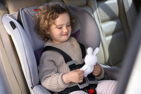 Cute little girl with toy rabbit sitting in child safety seat inside car