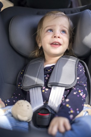 happy toddler girl sitting in a car seat, safety baby chair travelling