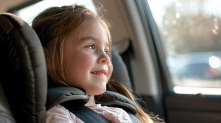 Smiling Young Girl Safely Buckled in a Car Seat Enjoying a Car Ride