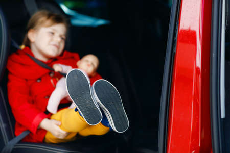Happy pre teen girl and preschool boy sitting in car seats with lovely smiles on their faces and holding doll by hand which also in car seat. Child transportation safety, family travel, focus on girl